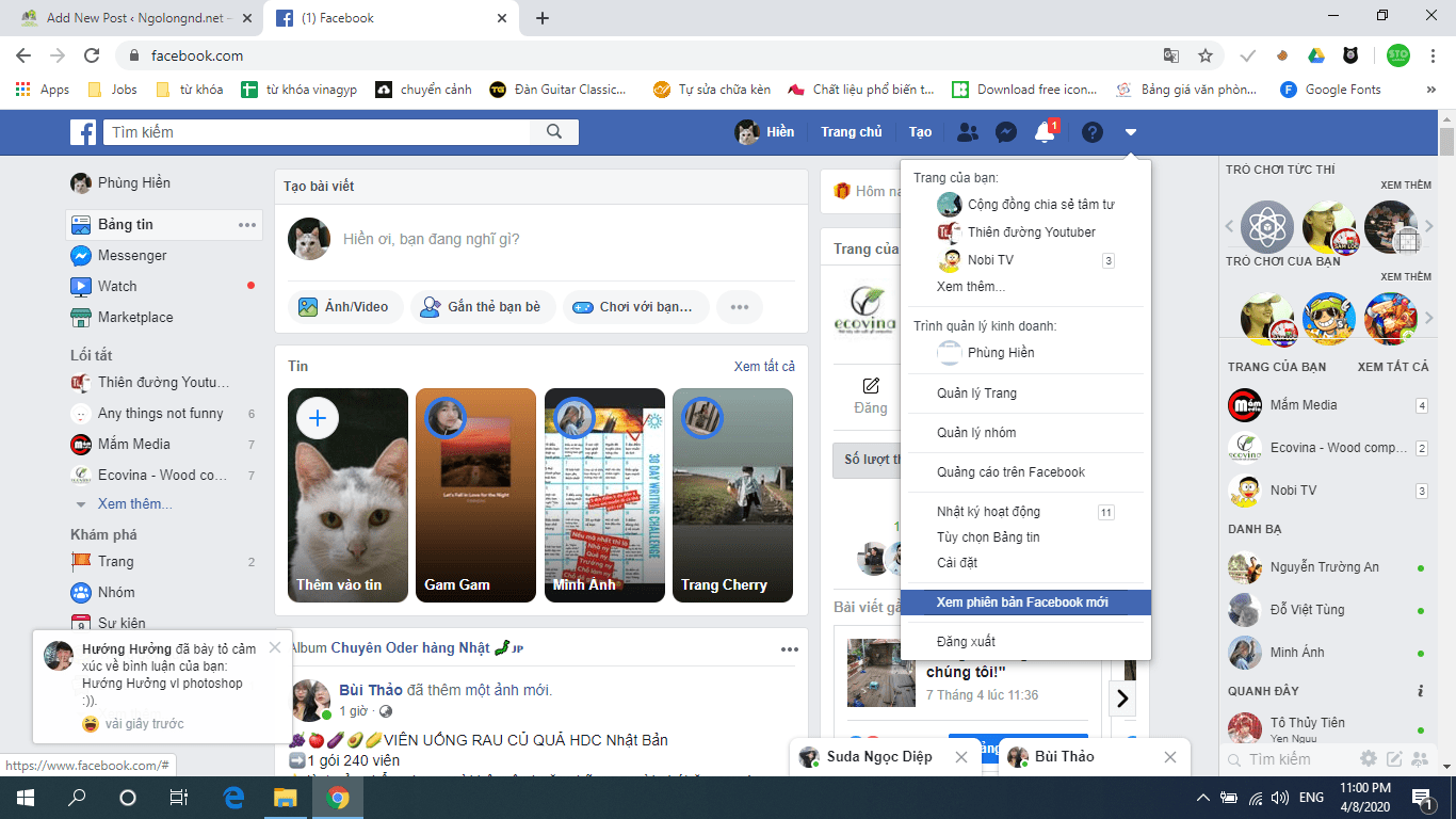 So you have successfully switched to the new Facebook interface, now you will see the interface is divided into 3 main columns, the first column is the Fanpage that you are managing and the settings and features, just like Menu interface of Facebook Mobile. The right column will be a miniature version of Messenger with the contacts you often text, the interface looks more modern than the old version.