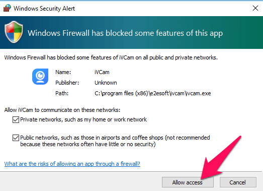 The first time you run iVCam, you’ll see a message asking for access in the network (from iPhone to computer). Select Allow access to confirm.
