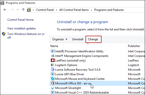 In the list of programs installed on your computer, click Microsoft Office 365 , then Change / Repair on the Command bar (Commnad Bar is a toolbar that does not automatically appear in every the application, which is only enabled when the user performs a specified action. The Command Bar includes tool buttons corresponding to the operation you are performing).