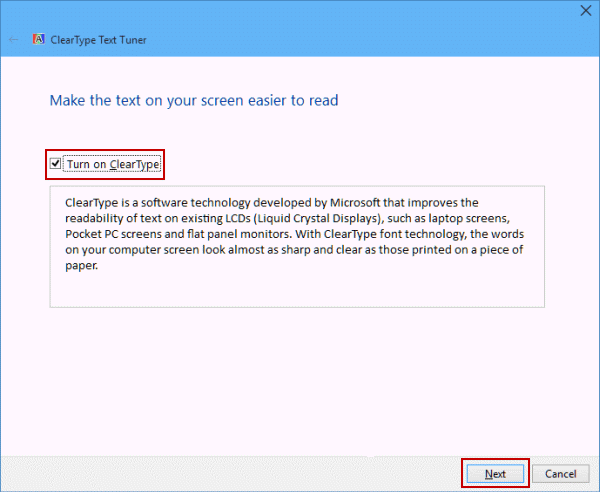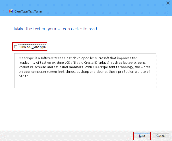 In the ClearType Text Tuner window , uncheck the Turn on ClearType box and select Next