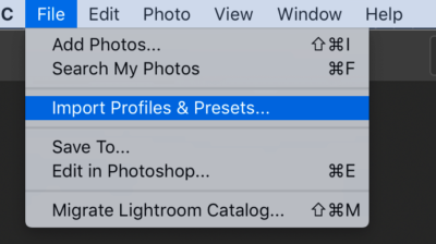 To do this, you’ll want to click File > Import Profiles & Presets then navigate to your .lrtemplate preset files to import them.