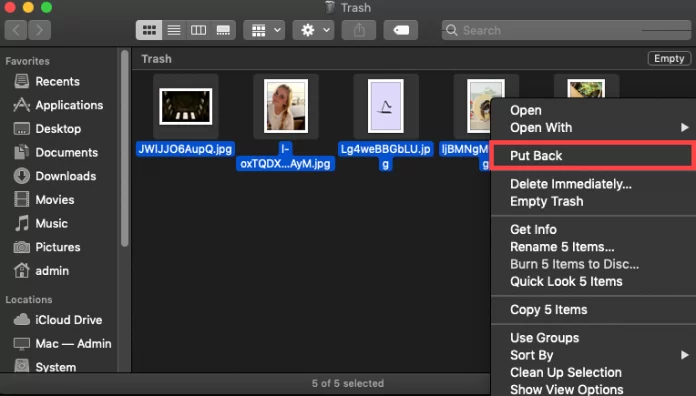 Step 3. Right-click on any of the selected photos and choose the Put Back option.