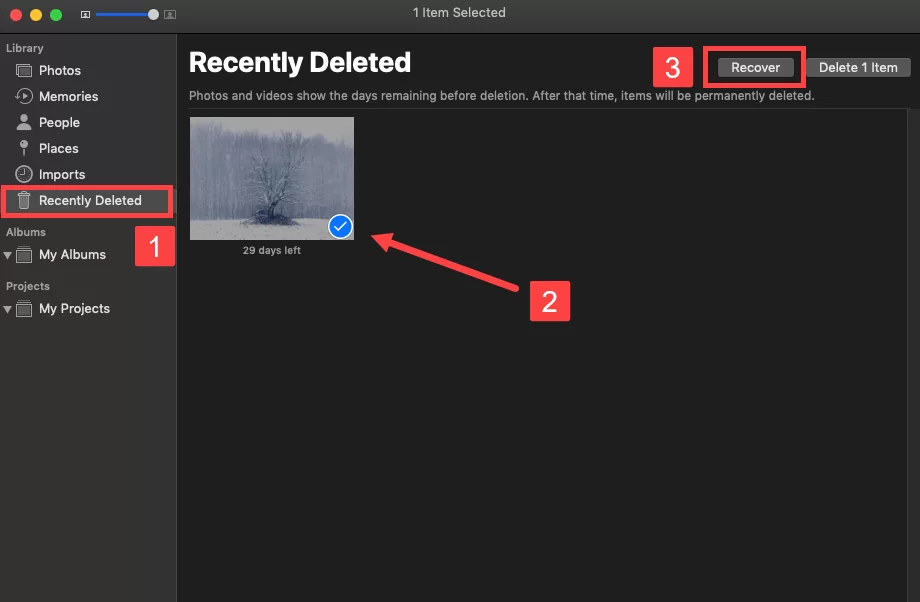 Step 1. Open the Photos app and select Recently Deleted from the column on the left.