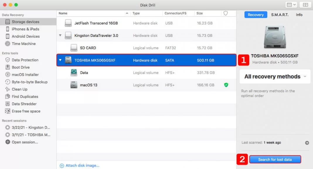 Disk Drill is a user-friendly data recovery Mac tool that can restore images that are no longer available in the Photos app or Trash. Its one-click approach to data recovery makes it great for regular Mac users who don’t understand how photo data recovery on Mac works.