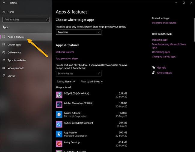 2. Go to Apps> Apps & Features .