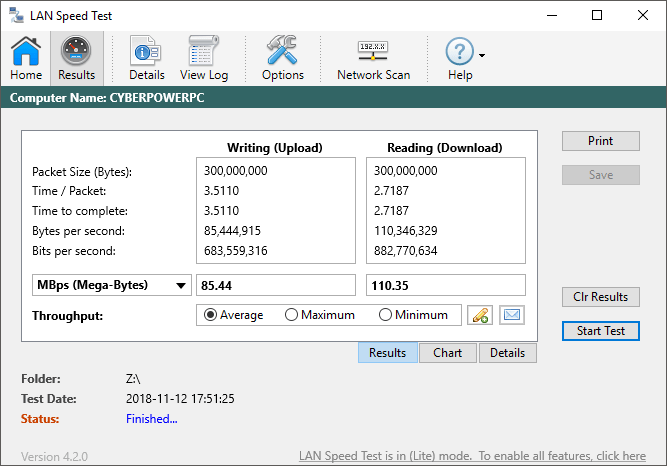 It depends on the speed of the LAN card in the machine and the HDD speed. If 1000Mbps is about 30 – 50 MB / s. But the cable also affected, if the 100Mbps wire is 11MB / s is correct then.