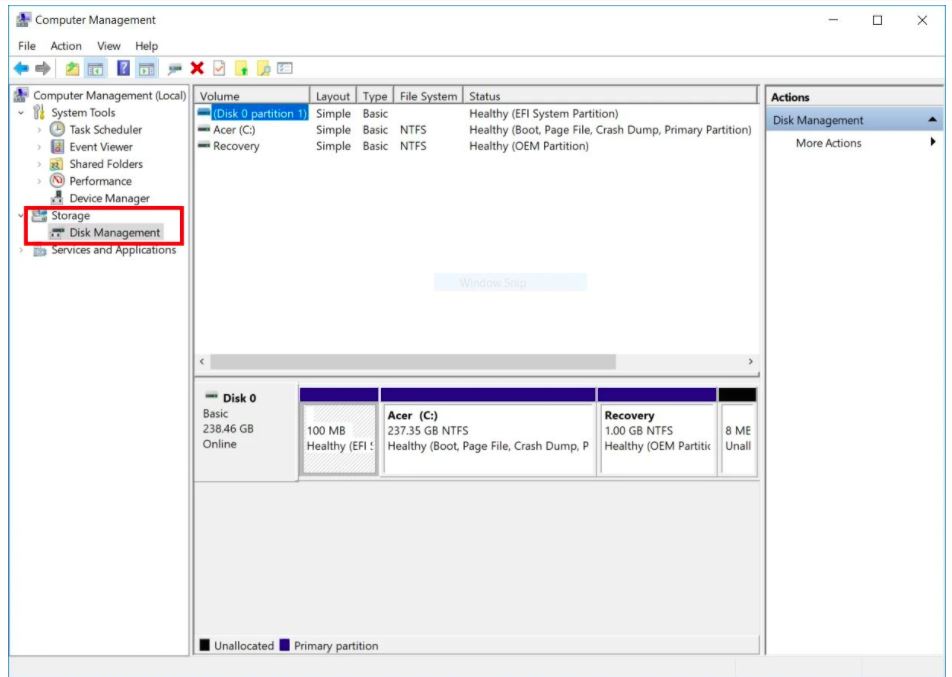 The Computer Manager window will appear as shown. In the list on the left, click on Disk Management .