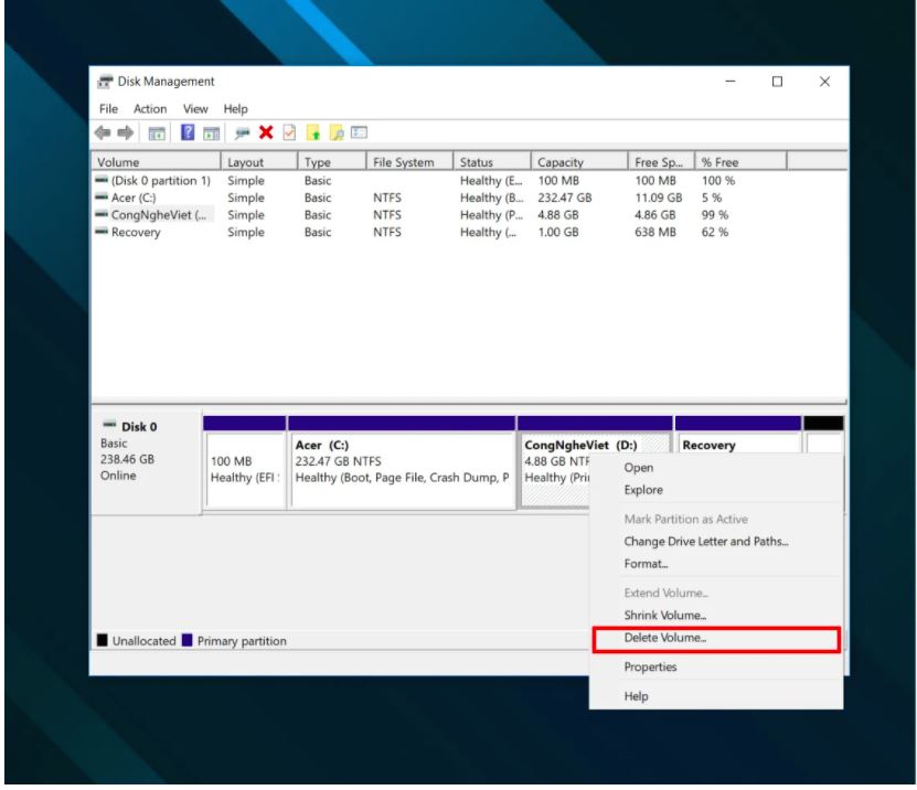 In this tutorial we will proceed to merge 2 hard drives together. Right-click on the first drive and select Delete Volume .