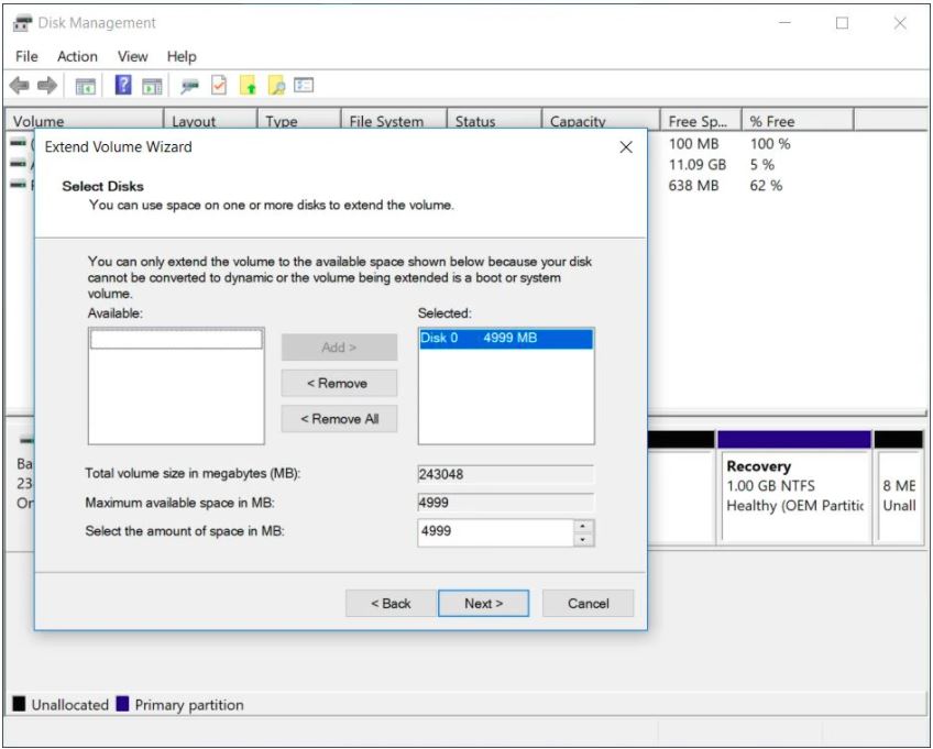 In the Selected box, the drives are in the Unallocated state and allow you to merge. Click on the first drive and click Next .