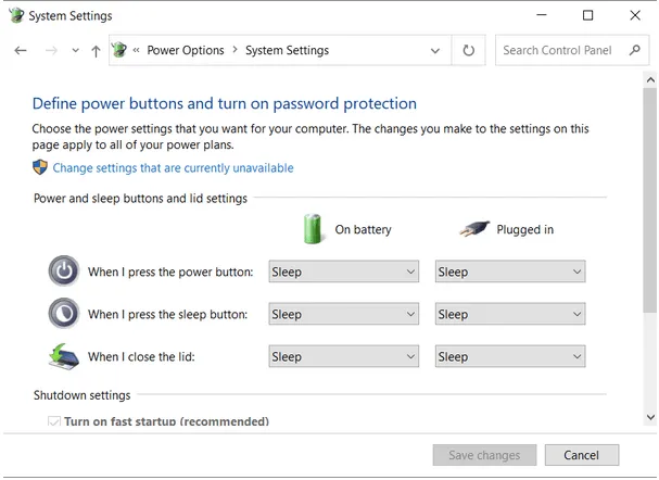 STEP 6- Find the Shutdown setting and uncheck the Turn on fast startup (recommended) feature. Click the Save Changes button and restart your computer successfully.