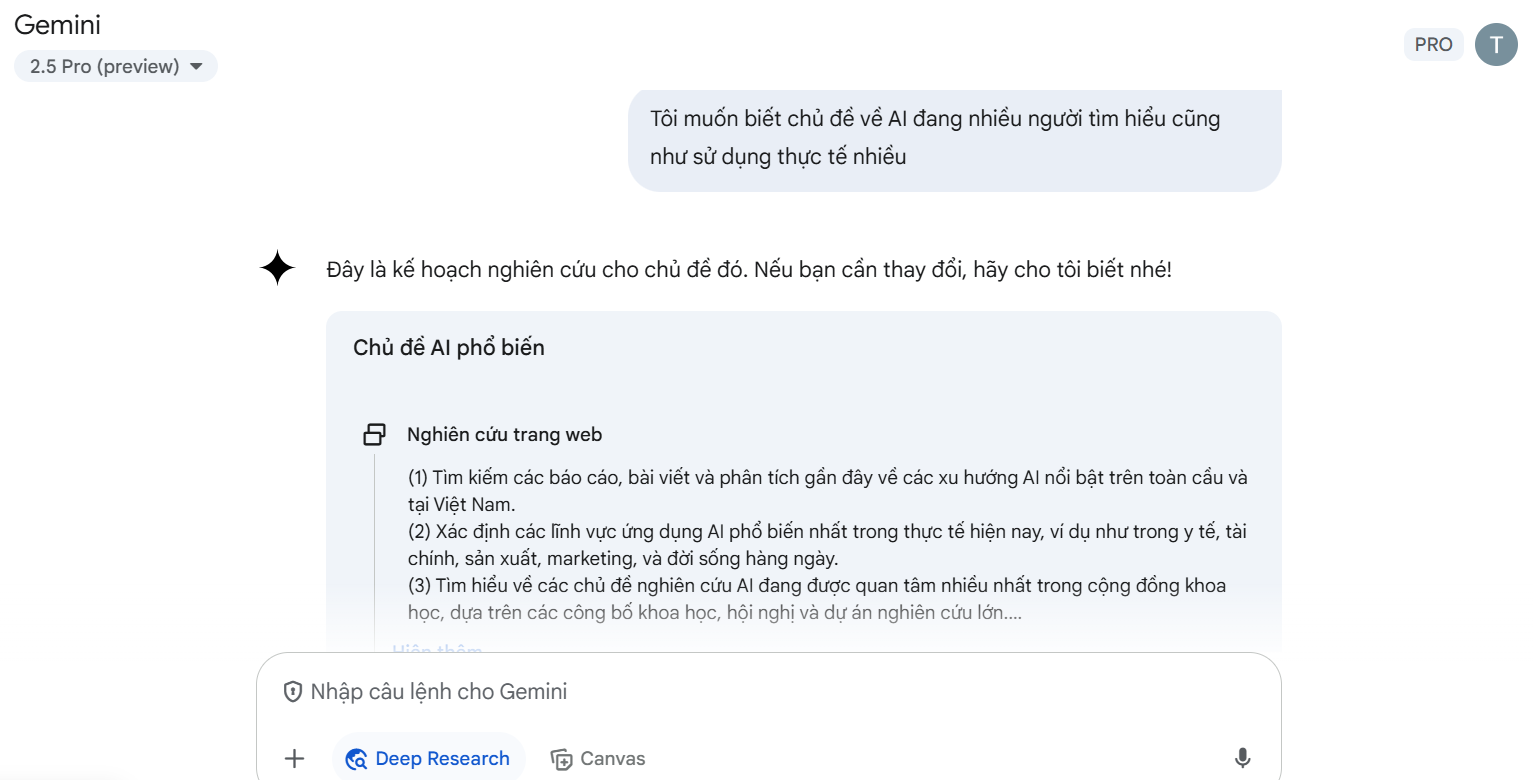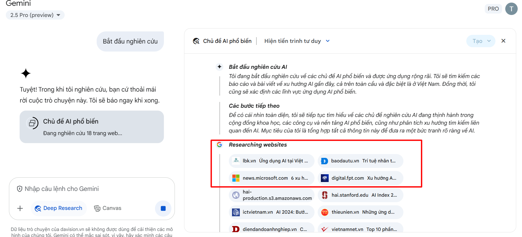 The Deep Research feature in Gemini is not just a smart search engine, but a real research assistant , capable of professional analysis, synthesis, and citation. The tight operating process from understanding the question to synthesizing with clear structure and citation helps users save time while still ensuring the highest quality of information .