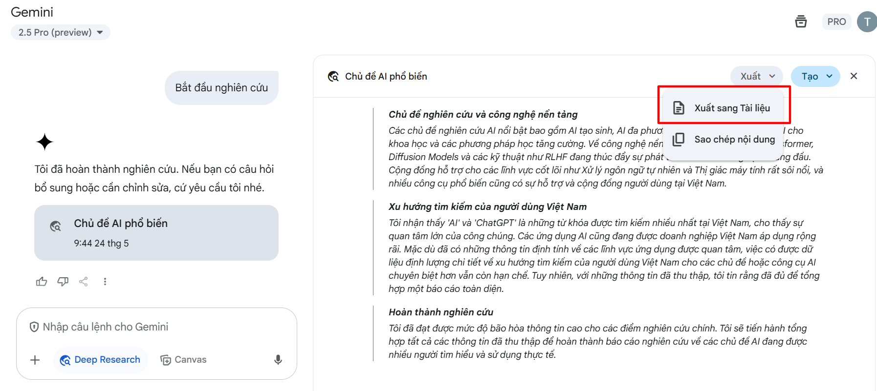 Meanwhile, Deep Research aims to research and analyze in depth a complex topic or one that requires many different perspectives. For example: “Comparing AI models in education”, “Impact of blockchain on the financial industry in Vietnam”.
