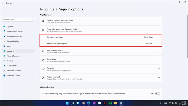 In addition, you can register more fingerprints by selecting Add a finger or removing fingerprints at Remove.